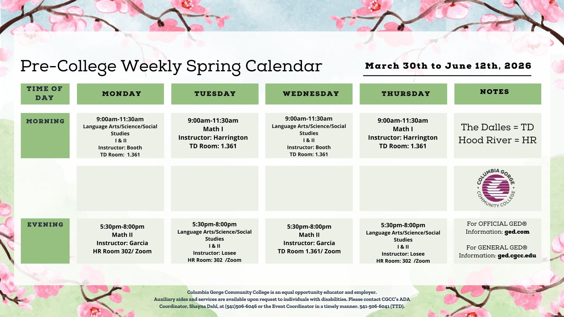 - General Education Development (GED®) classes develop the skills needed to pass the four subjects of the GED® test (Math, Language Arts, Science, and Social Studies).